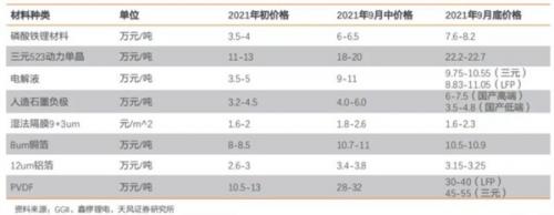 2021年以来,因下游景气高涨,动力电池原材料供不应求,四大主材、镍/钴/锂/铜/铝、氢氧化锂、碳酸锂、六氟磷酸锂、PVDF、VC等价格集中上扬,部分辅材较年初上涨数倍,甚至“一货难求”。