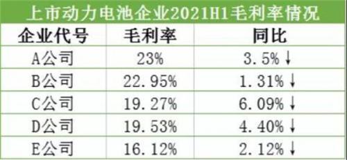 2021上半年头部5家上市公司动力电池业务毛利率均出现了不同程度的下滑,且整体毛利率处于23%及以下。
