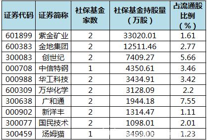 从持股比例看,社保基金持有比例最多的是广和通,持股量占流通股比例为7.56%,其次是创世纪,社保基金持股比例为5.67%;持股比例居前的还有中信特钢、华工科技、万华化学、国民技术、金地集团等。持股数量方面,社保基金持股量最多的是紫金矿业,共持有3.03亿股;金地集团、创世纪等紧随其后。