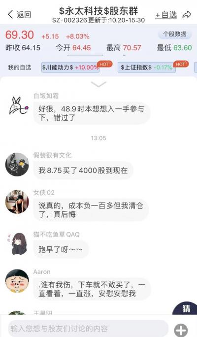 在尺度APP的永太科技股东群,不少投资者分享重仓永太科技巨额收益的喜剧,“永太科技真是从来没有人让人失望过。”但也有投资者担忧涨幅过大,过早地下了车,而错失这次财富倍增机会。