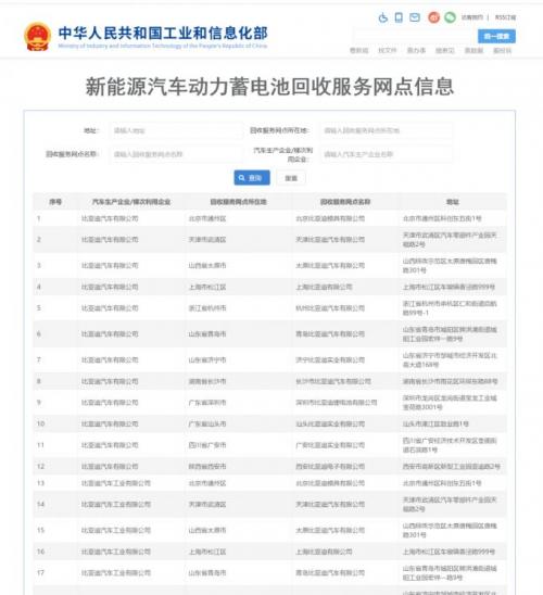 目前,在工信部上挂名的网点一共有13,137个,其中大概可以分为三类,一类是汽车企业官方回收的渠道,这部分一般都是销售公司也就是4S店,以及一些经销平台的合作网点,主要有比亚迪、吉利、北汽新能源等等,第二类是汽车企业下属的拆车公司,第三类是具备《再生资源经营许可证》、《危险品道路运输许可证》等种种资质的新能源企业。