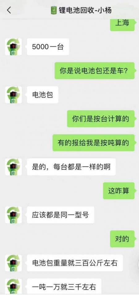 “现在的报价大概是9000块钱一吨?具体情况我们还要看电池电量,你可以把电池铭牌发给我。”这是记者向某二手交易平台咨询到废旧动力电池时,买家向我们报出的价格