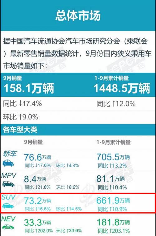 近日,乘联会公布了2021年9月的汽车销量情况。国人最关注的SUV,本月卖出了73.2万辆,同比下降16.6%,环比增长了14.5%;而1-9月的累计销量达到了661.9万辆,同比增长10.9%。尽管缺芯严重,但整体形势并没有想象中差。