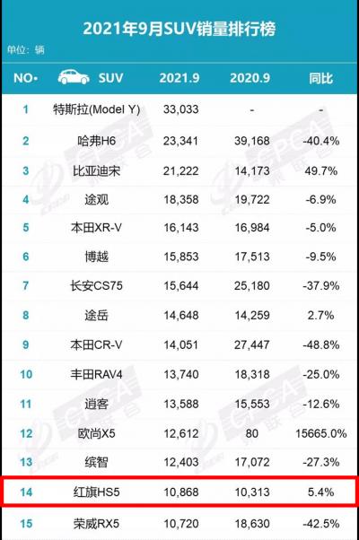 以往在SUV Top15销量排行榜上,豪华品牌车型:宝马X3、奥迪Q5L、奔驰GLC基本都能占据好几个席位的。但是在9月,它们却全都名落孙山,整个榜单唯一上榜的豪华品牌车型,就只有自主的红旗HS5。