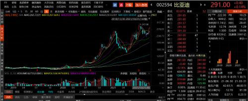 比亚迪股价则是从去年5月份55元左右上涨到截至20日收盘的290.6元,上涨幅度达到了428%,总市值也超过8000亿,而在八月初时,比亚迪市值一度超过9000亿。