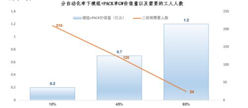 自动化率的提升,带来的模组和PACK价值量的提升非常的显著。在当下全市场自动化率5-10%的情况下,单GW产线价值量只有0.2亿,当自动化率提升到45%时单GW产线为0.7亿元,而当自动化率达到85%时,单GW产线价值量就会提升到1.2亿元,这个价值量是现有全产线价值量1.5亿的80%。