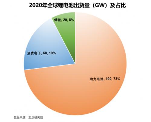 目前锂离子电池的下游,主要有三大用途,汽车、手机等消费电子以及储能。根据起点研究院的统计,2020年底,全球锂离子电池的出货量约为260GW,其中用于汽车的动力电池大约为190GW,3C消费电子50GW,储能20GW。