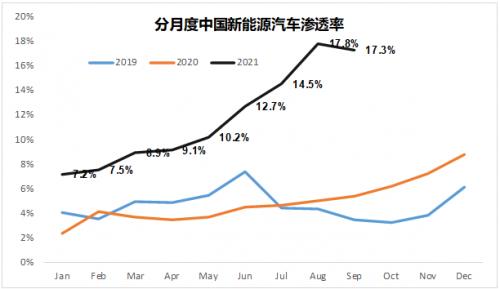 上图是中国新能源汽车的月度渗透率。我们都知道,2021年新能源汽车销售火爆,但不会想到这么火爆。新能源汽车的渗透率从年初的7.2%一步一个台阶的提升,到了8月已经到了17.8%,9月17.3%。