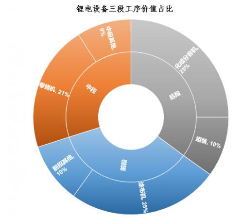 目前市场上每GW锂电设备的投资额大约在1.5亿元左右,一般将锂电设备按照工序分成前中后三段,前中后段设备的价值量占比分别为35%、30%和35%,前段设备的核心是涂布机、中段是卷绕机,后段则是化成分容设备。