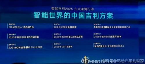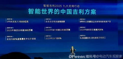 根据规划,到2025年,吉利集团要实现年销365万辆汽车;5年投1500亿研发;实现自动驾驶全栈自研;五年内,吉利汽车集团旗下各品牌将推出超过25款全新智能新能源产品,引领中国品牌进入智能终端时代。