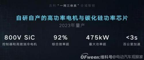 电驱方面,吉利将应用800V,基于碳化硅功率器件的控制器和高效油冷电机,实现综合效率超92%,最大功率超475千瓦,最极致的产品可实现百公里加速低于3秒的超高性能体验。吉利自研自产的碳化硅功率芯片,也将于2023年量产。