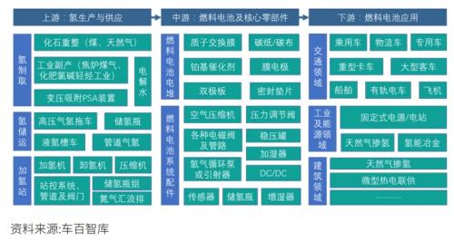 按照产业链由上到下的次序,氢能源产业链可以分成三段,它的上游,是氢生产与供应;中游,是燃料电池及核心零部件,而它的下游,则是燃料电池应用。