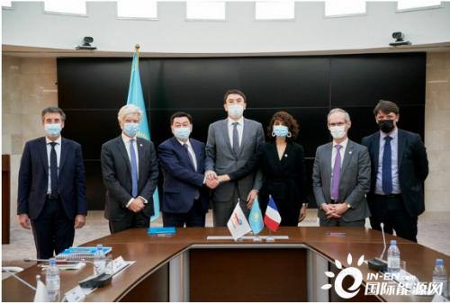 哈萨克斯坦共和国能源部长Magzum Mirzagaliyev(中)和哈萨克斯坦国家石油天然气公司首席执行官Alik Aidarbayev(左三)与能源开发商Saft、Total Eren和Total Energies公司代表在签署现场合影。