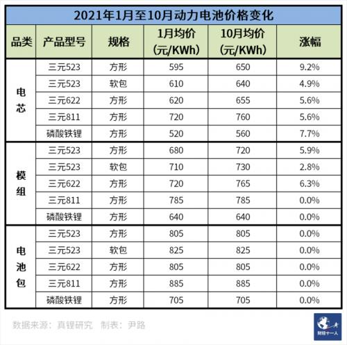 2021年1月-10月,电芯价格还有小幅增长,而模组与电池包作为电池企业交付客户的主要产品形态,价格几乎没有波动,锂电池产业链价格上涨的压力几乎都被消纳在电池制造环节。