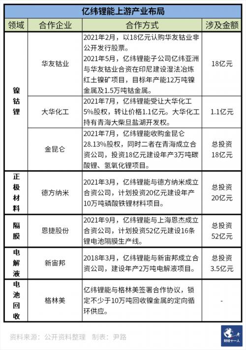 亿纬锂能与宁德时代类似,在矿产领域,通过入股增强自己对上游资源的影响力,而在其他领域,则主要通过与头部企业联合投资扩产的方式,锁定产能,并对冲价格影响。