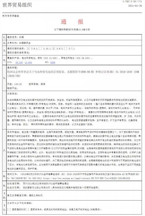 欧盟在2021年1月26日向世贸组织通报了《关于电池和废电池的法规提案》,2022年1月1日开始执行。新规对2KWh容量以上的电池提出了碳足迹、再生原材料、电化学性能和耐久性、可拆卸和可替换性、二维码标签和CE标签、电池管理系统、电池护照、安全性等要求,并对运营商的尽职调查和废旧电池的回收和处理提出新要求。从2024年7月1日开始,只有建立完整碳足迹的动力电池产品才能在欧盟市场投放。