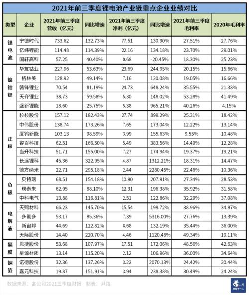 10月底,上市公司纷纷发布第三季度财报,《财经十一人》按照电池企业、镍钴锂矿产企业、正极、负极、电解液、隔膜、铜箔的分类梳理了产业链重点企业的业绩表现,见下表。
