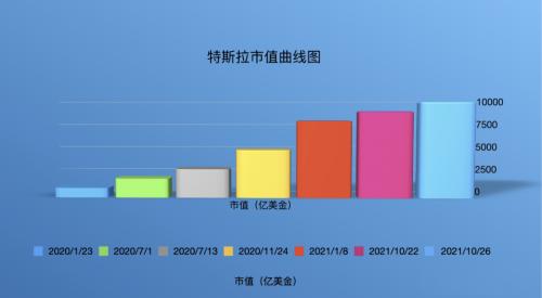 2021年10月26日,特斯拉股价又奔新高,特斯拉正式跨过了10000亿美元的门槛。