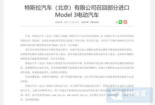 11月5日,特斯拉汽车(北京)有限公司日前向国家市场监管总局备案了召回计划,自即日起,召回生产日期在2019年2月2日至2019年10月20日期间的部分进口Model 3汽车,共计91辆。此次召回范围内的部分车辆在制造过程中,前副车架总成上的横向连杆固定螺栓可能未按标准扭矩紧固。长期使用后螺栓可能松动或从副车架上脱出,最终可能导致前悬架横向连杆从副车架上脱出,会影响车辆操控和增加发生碰撞事故的风险,存在安全隐患。
