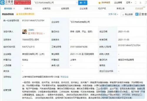 企查查APP显示,11月5日,飞凡汽车科技有限公司成立,法定代表人为王晓秋,注册资本70亿元人民币,经营范围包含:小微型客车租经营服务;二手车经销;电池销售;机动车充电销售;互联网销售等。