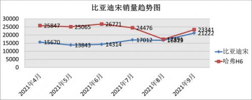 在上半年的时候,比亚迪宋其实还是离哈弗H6比较远的,但是在进入到下半年之后,它俩的差距就在不断缩小。尤其是在8月、9月的时候,它更是取代了长安CS75,成为了销量离H6最近的一款SUV。诚然,宋的奋起直追有缺芯因素在起作用,但不可否认的是,比亚迪宋确实有在逐步上涨的趋势。