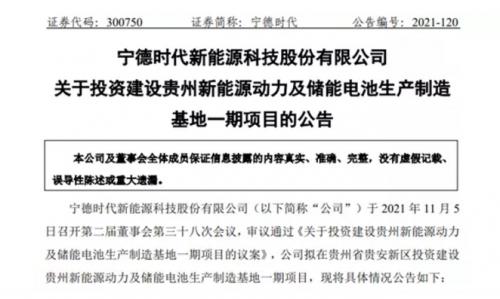 近日,动力电池制造商巨头之一的宁德时代发布公告称,公司审议通过了《关于投资建设贵州新能源动力及储能电池生产制造基地一期项目的议案》。