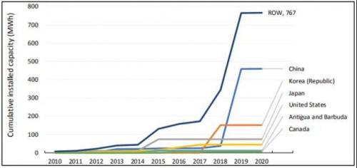 2010-2020年全球液流电池装机量增长情况(MWh)