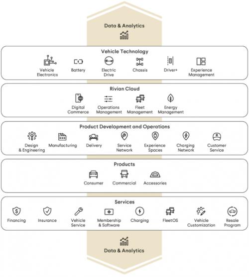 垂直整合的生态系统:Rivian目前已经形成了初具规模的垂直生态系统,涵盖了从车辆技术、云、产品开发运营、具体细分车型、服务以及数据分析在内的六个部分。