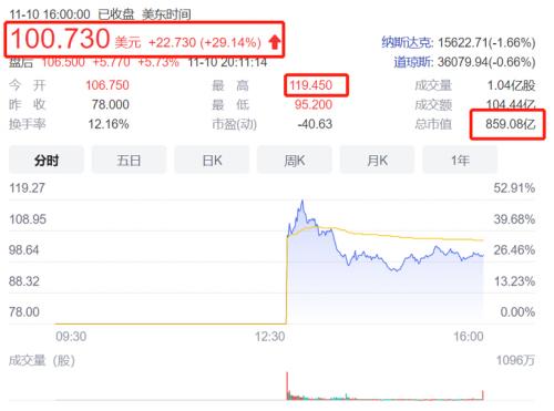 美东时间11月10日,Rivian正式登陆纳斯达克全球精选市场,上市首日股价一度飙升52.6%,最高涨至119美元,最终以100.73美元收盘,较IPO发行价上涨29%,市值达到859亿美元。在完全稀释的基础上,包括期权和限制性股票,Rivian的估值约为986亿美元。