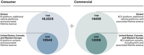Rivian将其市场机会分为可获取市场总规模(TAM,长期内)和可服务的潜在市场规模(SAM,三年内),基于消费者和商用车辆的新车销售市场,以及车辆的终身收入(LTR)潜力(包括车辆的转售),Rivian估计其TAM为9万亿美元,SAM是1万亿美元。