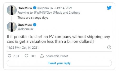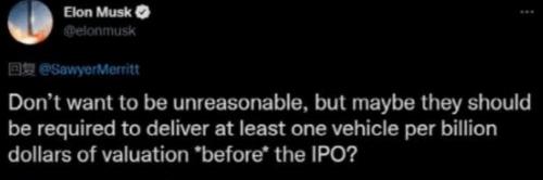 市值方面,Rivian上市首日市值便达到859亿美元,超过在汽车市场打拼多年的福特(773.7亿美元),并逼近通用(860.5亿美元)。事实上,早在Rivian传出IPO消息时,其高额的融资规模和估值预期就引得马斯克都亲自下场吐槽:“真是奇怪,一辆车都没交付的公司能轻松获得如此高的估值。在IPO之前,它们应该至少为每10亿美元估值交付一辆车!”