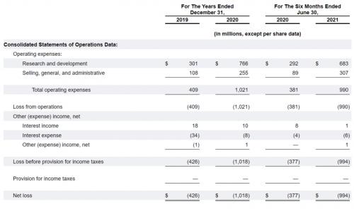 在公司运营上,从Rivian的招股书中可以看出,该公司近几年来一直处于亏损状态。其中,2019年,该公司净亏损4.26亿美元,2020年净亏损10.18亿美元,今年上半年净亏损9.94亿美元。因开始生产R1T皮卡增加相关成本,Rivian仅今年第三季度的净亏损就高达12.8亿美元。从中可以看出亏损一直在持续扩大,尽管这在初创公司中也属正常,但对投资者来说,这是一个重大的风险因素。成功如特斯拉,也用了15年才实现盈利,Rivian要实现盈利估计也有很长的一段路要走。