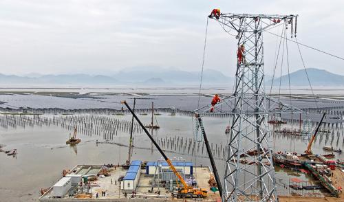 11月8日,在台州玉环市干江镇,施工人员正在进行华电玉环海上风电送出工程立塔架线,该工程计划11月中旬投运。华电玉环海上风电总装机容量15.4万千瓦,并网后每年提供约8.8亿度清洁电能,折合节约标煤26.58万吨,减少二氧化碳排放58.4万吨,对保障能源供给、优化能源结构、推动绿色低碳发展具有积极意义。