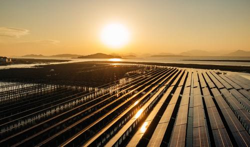 落日余晖中的玉环华能清港滩涂渔光互补光伏电站。陈维益摄