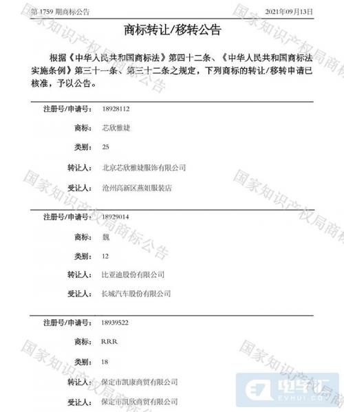 5、比亚迪将商标“魏”转给长城汽车