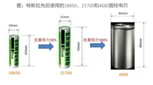 所谓4680,其实是对电池尺寸的概括(圆柱电池尺寸为直径46mm,电池高度80mm),以此替代此前特斯拉使用的主流18650电池和21700电池。
