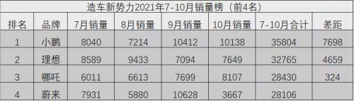 可以先从整个下半年总体销售数据做个对比。7-10月,蔚来总销量为28106台,小鹏、理想、哪吒总销量分别为35804台、32765台、28430台。
