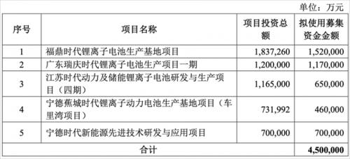 在募集资金用途方面,调整后的方案剔除了93亿元的“补充流动资金”和31亿的宁德时代湖西锂离子电池扩建项目(二期),并将宁德蕉城时代锂离子动力电池生产基地项目(车里湾项目)的募集资金使用金额由54亿元减少至46亿元。