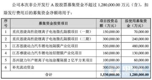 电车汇消息:11月22日,恩捷股份公告称,拟募集资金总额不超过128亿元,将用于重庆恩捷高性能锂离子电池微孔隔膜项目、江苏恩捷动力汽车锂电池隔膜产业化项目、江苏睿捷动力汽车锂电池铝塑膜产业化项目、苏州捷力年产锂离子电池涂覆隔膜2亿平方米项目并补充流动资金。同时公司拟终止购买上海恩捷新材料科技有限公司股权。