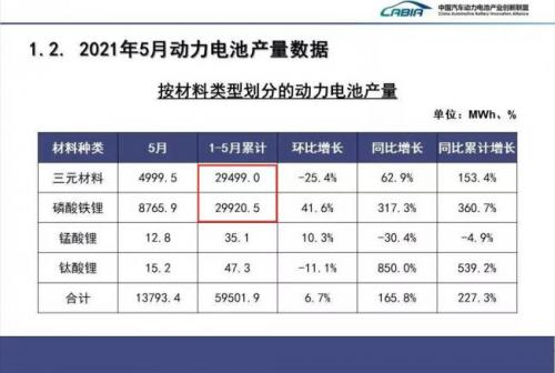 但是到了2020年,三元电池的产量和装车量占比分别降至58%、61%。2021年前5个月,三元电池的产量占比降至49.6%,而磷酸铁锂电池产量占比升至50.3%,首次超过三元电池。