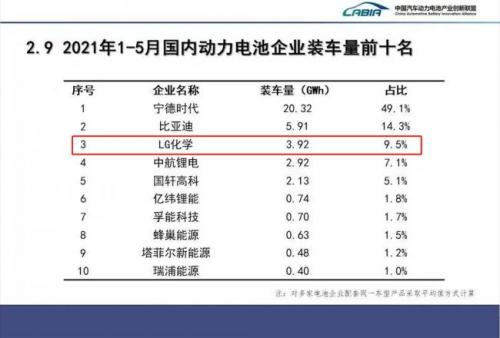 中国汽车动力电池产业创新联盟发布的数据显示,2020年之前,我国动力电池企业装车量排名前十中,没有一家外资电池企业。但是在2020年1月,也就是特斯拉Model 3国产化后,松下和LG化学首次挤进前十名单。2020年全年,LG化学排第三,仅次于宁德时代和比亚迪,松下排第六。2021年前5个月,LG化学牢牢占据第三的位置,市占率提升至9.5%,而宁德时代市占率跌落50%以下。