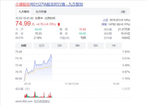 但如果再通俗易懂的讲就是“华为将深度赋能AITO”。受上述消息利好,小康股份当日盘中一度大涨7%,截至12月2日收盘,小康股份涨收4.26%,股价为70.23元/股,总市值达955亿元。