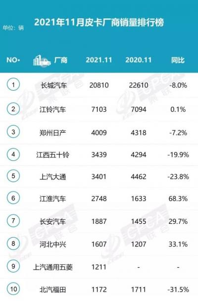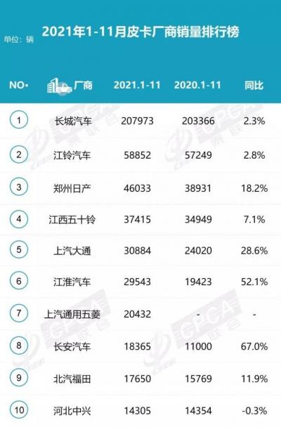 2021年1-11月皮卡市场的累计销量排名详见下图: