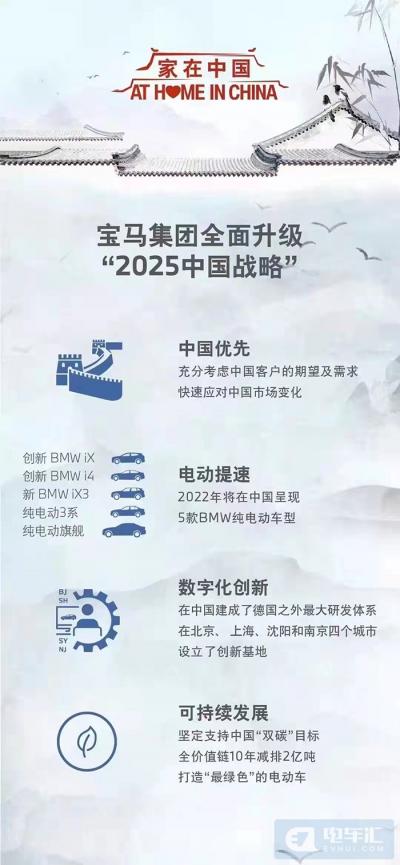 宝马集团的中国战略升级可以用“1”“2”“3”“4”“5”“2025”“2亿”和“1.5”这串数字来描述::“1”指“中国优先”原则(China First);“2”指BMW和MINI两个品牌扎根中国;“3”指电动化、数字化和可持续三个方向;“4”指北京、上海、沈阳和南京的四个研发和数字化基地;“5”指2022年将拥有5款BMW纯电动车型;“2025”代表将在2025年到来的“新世代”车型;“2亿”和“1.5”分别代表宝马2030年的减碳目标和对《巴黎协定》1.5度控温目标。