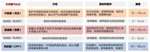 为了同时满足这些需求,铝塑膜必须由数层厚度只有几十微米的薄膜贴合而成(外阻层,阻透层、热封层),各层之间以胶水或热熔树脂粘结。