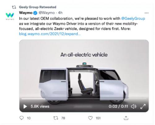 12月29日,吉利和Waymo都官宣,吉利旗下电动车品牌极氪和全球领先的自动驾驶技术公司Waymo的合作。