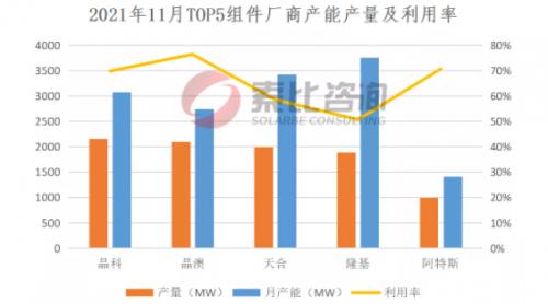 2021年11月,终端需求上升,因此本月组件产量比上月大幅回升。国内组件产量15.65GW,环比增长14.48%。按照产量排名,晶科、晶澳、天合、隆基、阿特斯位列前五,企业总产量9.15GW,占比58.47%,综合开工率65.18%。预计12月下游组件价格大幅下调,组件需求将逐步回暖。