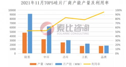 2021年11月,限电情况基本结束,各硅料厂恢复正常生产。但由于终端需求下降,所以头部硅片厂商降低产能利用率导致市场份额下降。2021年11月国内硅片产量19.53GW,环比增长10.21%。按照产量排名,隆基、中环、晶科、上机、晶澳位列前五,企业总产量14.15GW,占比72.45%,综合利用率72.22%。