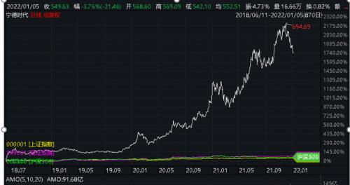 截止2022年1月5日,A股市场目前超过万亿市值的公司一共有6家,其中宁德时代(300750.SZ)以1.25万亿市值排名第四,作为上市刚刚满三岁半的电池制造商,一跃成为近年来资本市场的最大黑马,成为A股当中唯一市值超过万亿元大关的科技公司。