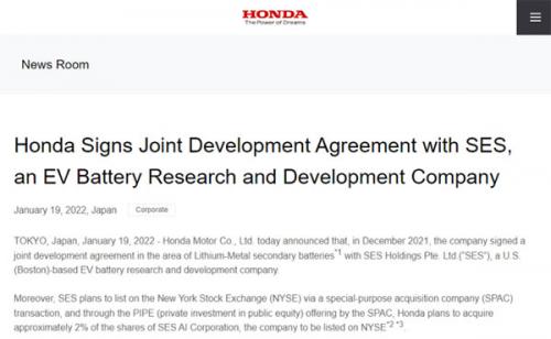 值得补充的是,除了与SES进行锂金属电池联合开发,本田还将对SES进行投资。此前,本田已决定通过参与SES与艾芬豪资本收购公司业务合并中的普通股私募股权投资(“PIPE”)融资,对合并后的公司进行投资。